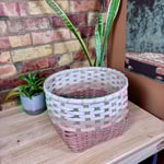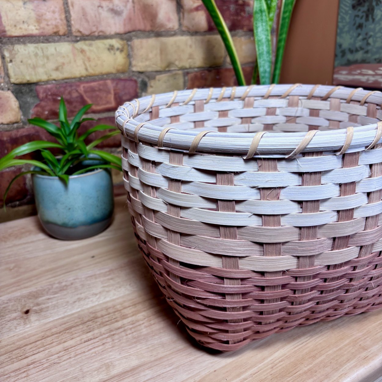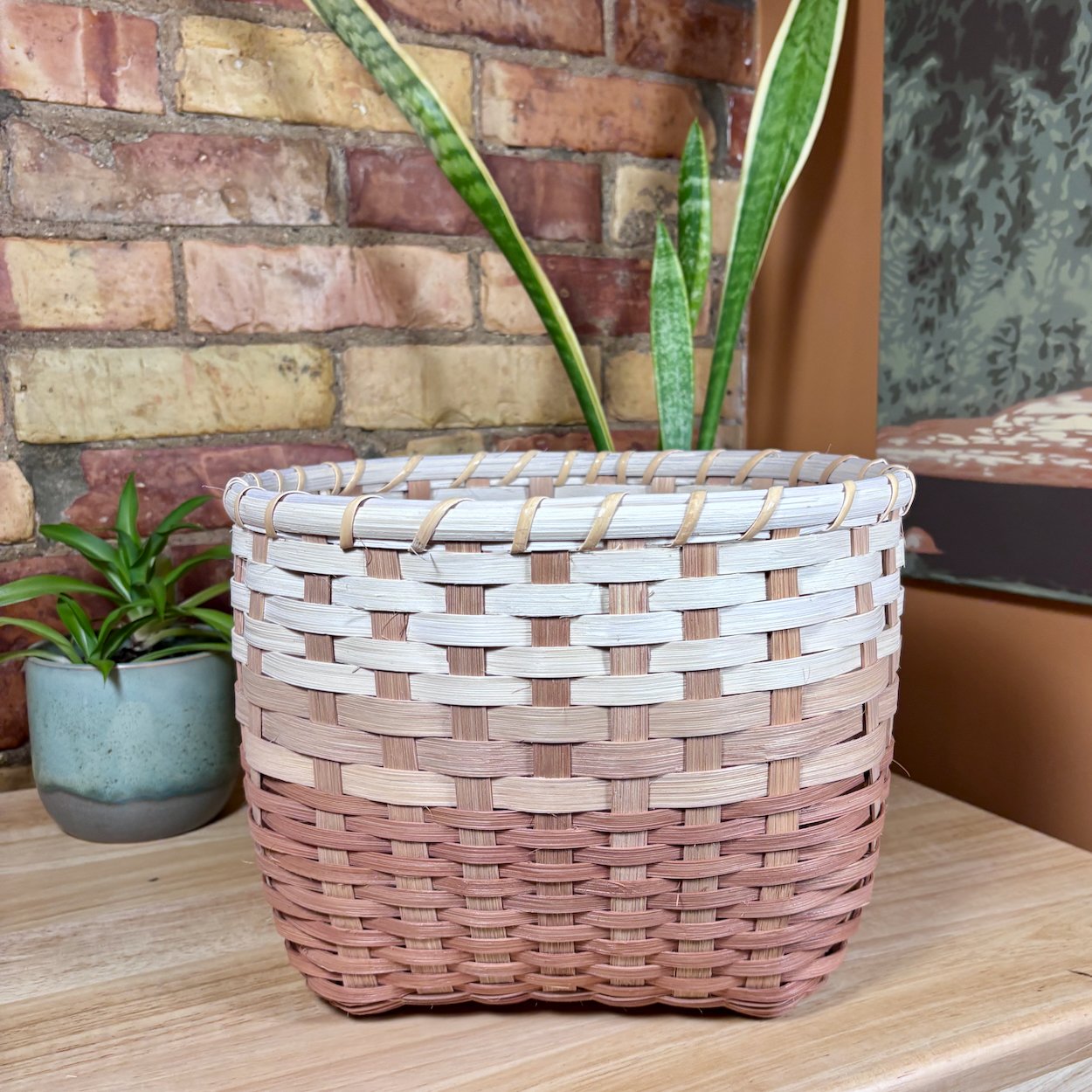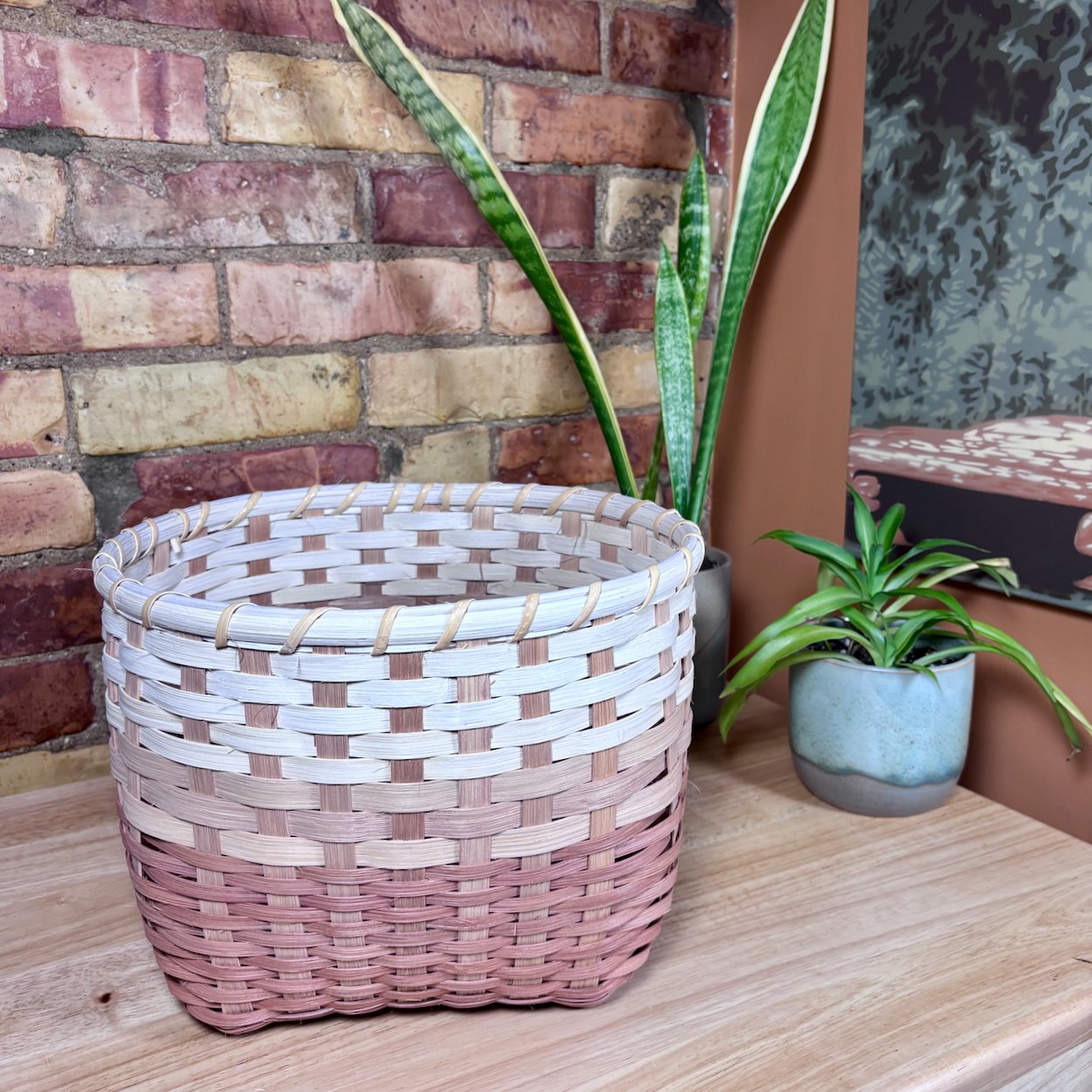 The Earth Collection captures the warm rusty tones of earth, layering natural dyes to create a sophisticated three tone pattern inspired by distinct layers of a soil horizon. The natural reed is hand dyed with a tannin rich base of gallnut to create a cream foundation, followed by layers of cutch and soda ash to produce rich earthy shades. Each piece features an intentional variation in the thicknesses of weavers while maintaining a clean, modern look with a flat stake and strand weave. Totes are finished with cranberry shaker tape, providing a bold structural accent that further draws out the deep red undertones and hidden warmth within the natural fibres.