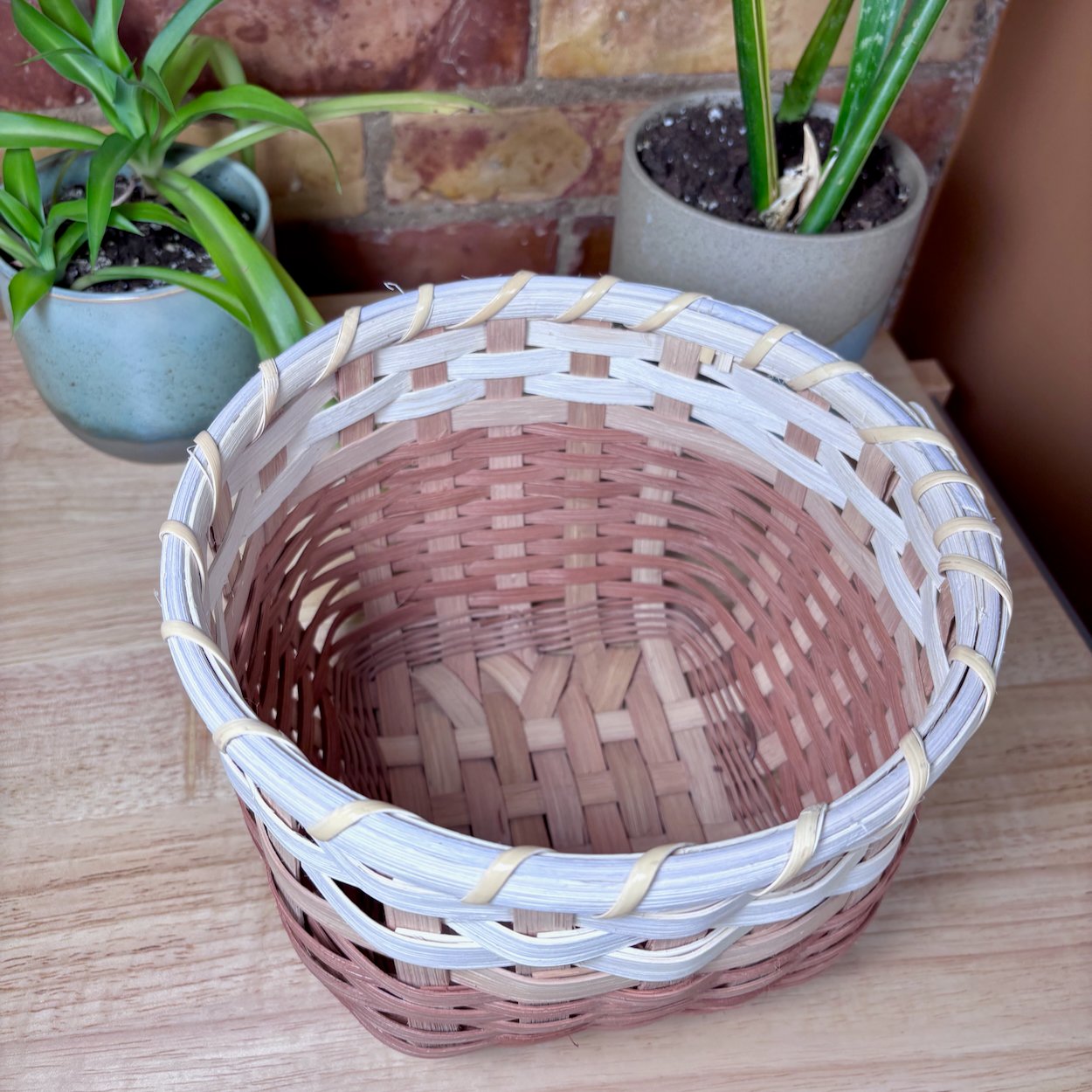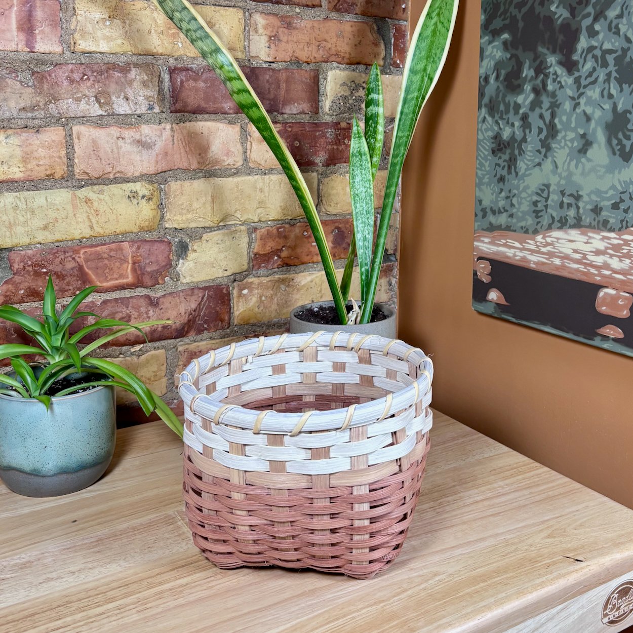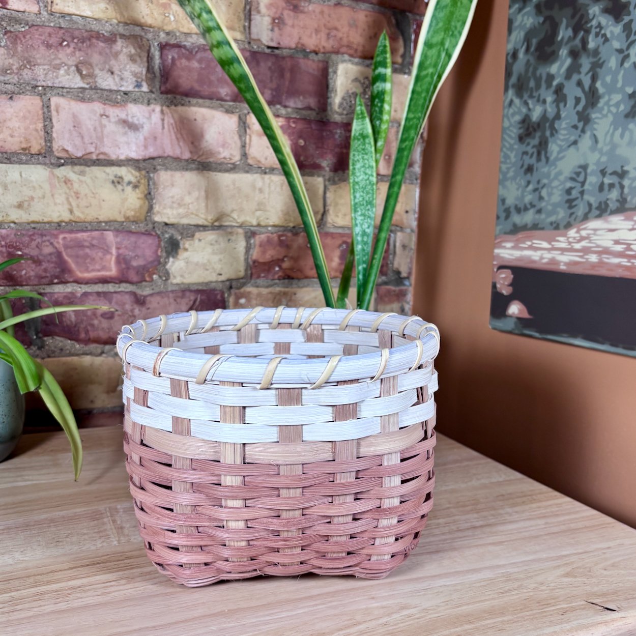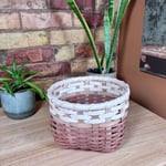 The Earth Collection captures the warm rusty tones of earth, layering natural dyes to create a sophisticated three tone pattern inspired by distinct layers of a soil horizon. The natural reed is hand dyed with a tannin rich base of gallnut to create a cream foundation, followed by layers of cutch and soda ash to produce rich earthy shades. Each piece features an intentional variation in the thicknesses of weavers while maintaining a clean, modern look with a flat stake and strand weave. Totes are finished with cranberry shaker tape, providing a bold structural accent that further draws out the deep red undertones and hidden warmth within the natural fibres.
