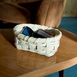 A versatile piece from our collection, this hand-woven organizer is crafted from natural reed. Perfect for tidying up small essentials on your desk, shelf, or counter. Approx. 7" x 5" x 3".
