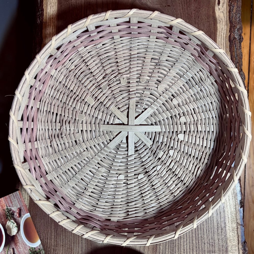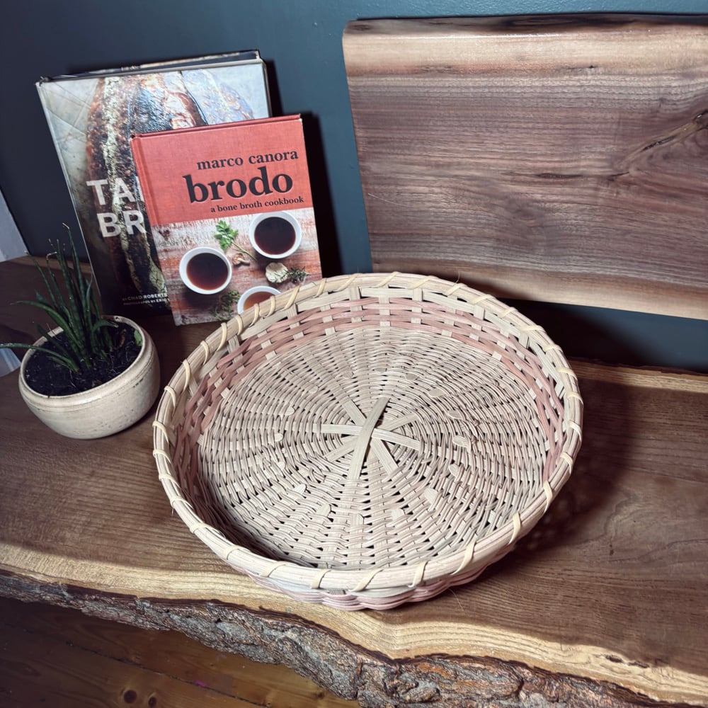 The large bowl / tray is designed to be a centerpiece, utilizing a broad, shallow form to beautifully display fruit, serve baked goods, or organize an array of items on a coffee table. Its construction features a round base with stakes added while twining, creating a durable and visually striking foundation. The generous 14 inch diameter makes it a functional and artistic statement piece, highlighting the subtle two-tone dye progression and the rich textures of the Naturals Collection in a prominent way.