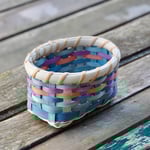 The Horizon Small Organizer is hand-woven from natural reed and features a turquoise speckled horizon with sunrise-inspired accents. Its intricate design, crafted with varying widths of reed and distinct gradients, beautifully brings the serene artistry of dawn to life. This charming organizer is perfect for tidying up small essentials on your desk, shelf, or counter, adding a touch of unique artistry to any space. Approx. 5" x 5 ½" x 3".